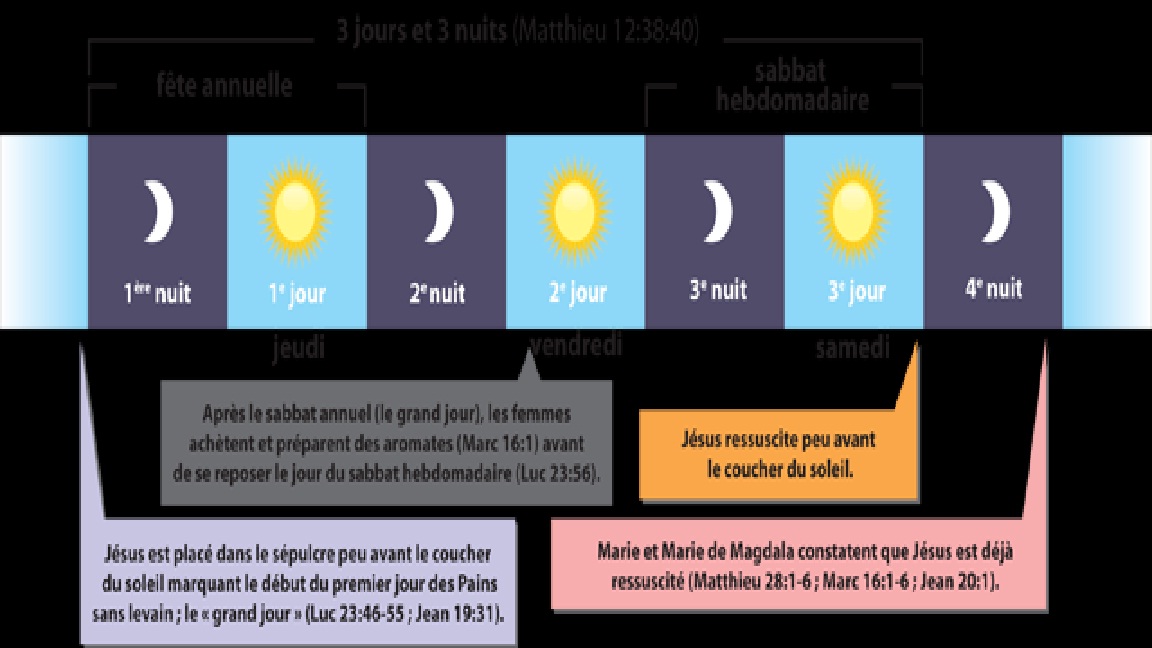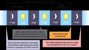 Le tableau ci-dessus fournit une chronologie précise de la crucifixion de Jésus et de Sa résurrection, conformément aux fétes de l'Éternel prescrites dans la Bible, et il fournit la preuve de la véracité du seul signe que Jésus donna prouvant qu'Il était le Messie !