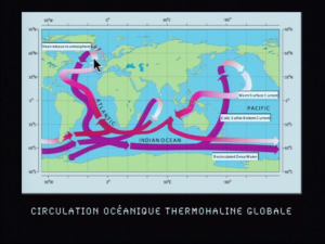 Andeha isika hamakafaka an'ity sary ity @ fomba tsotsotra (asa raha fiteny izay). Ilay izy dia azo ampitahaina @ ony mafana eo anivon'ny ranomasimbe, fa saingy lehibe im10 nohon'ny ony rehetra @'izao tontolo izao mitambatra. Mikoriana mamakivaky ny Ranomasimbe Atlantique ilay izy, ary rehefa tonga @ Pôles dia miakatra (satria mangatsiaka kokoa ny rano manodidina azy) ary mandefa hafanàna @ soson-drivotra. Manjary mavesabesatra kokoa sy masirasira kokoa ny rano ka milentika hatr@ faran'ny ranomasina ary miverina mikoriana mankany atsimo. Hitantsika @ sary fa misy sampany 1 miakatra mamakivaky ny Ranomasimbe Pasifika avy eo, ka rehefa tonga akaikikaikin'ny nosy Aléoutiennes, mihamafàna ka miakatra ary miverina atsimo, avy eo mandalo @ nosin'i Indonésie ary miteraka mousson, dia avy eo miverina @ Atlantika koa. Maharitra 1 000 taona ny tsingerina 1.