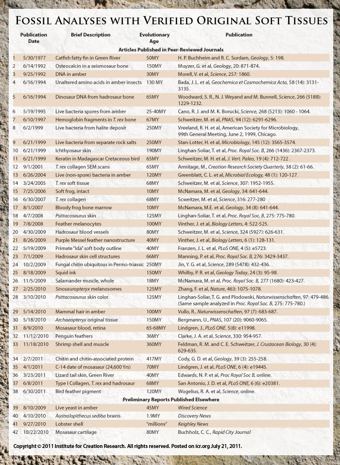Tsy mbola nisy nahita an'izao hatrizay satria tsy mbola nisy nitady an'izao hatrizay, satria matanjaka ny finoana ny "tapitrisa taona", ary raha ny tena marina dia aleon'izy ireo mitady fizotra hafahafa nahafahan'ireny taova malemy ireny ho voatahiry mandritry ny 65 000 000 taona toy izay miaiky fa aman'arivo taona monja izao tontolo izao, araky ny fitantaràna mazavan'ny Genesisy. Raha tsy efa nahita an'ireny selan-dra mena ireny i Schweitzer tà voalohany dia angamba tsy nieritreritra ny hitady an'izay izy (satria mantsy nalefa t@ ity taolana faha2 ity mba hodinihiny sao dia mahita selan-dra izy, satria efa fantatra fa lasa liana @'izany izy. Nalonany anaty rano misy asidra malemy vaika mandritry ny 1 volana ny taolana. Rehefa vita izay dia hita ny taova malemy).
